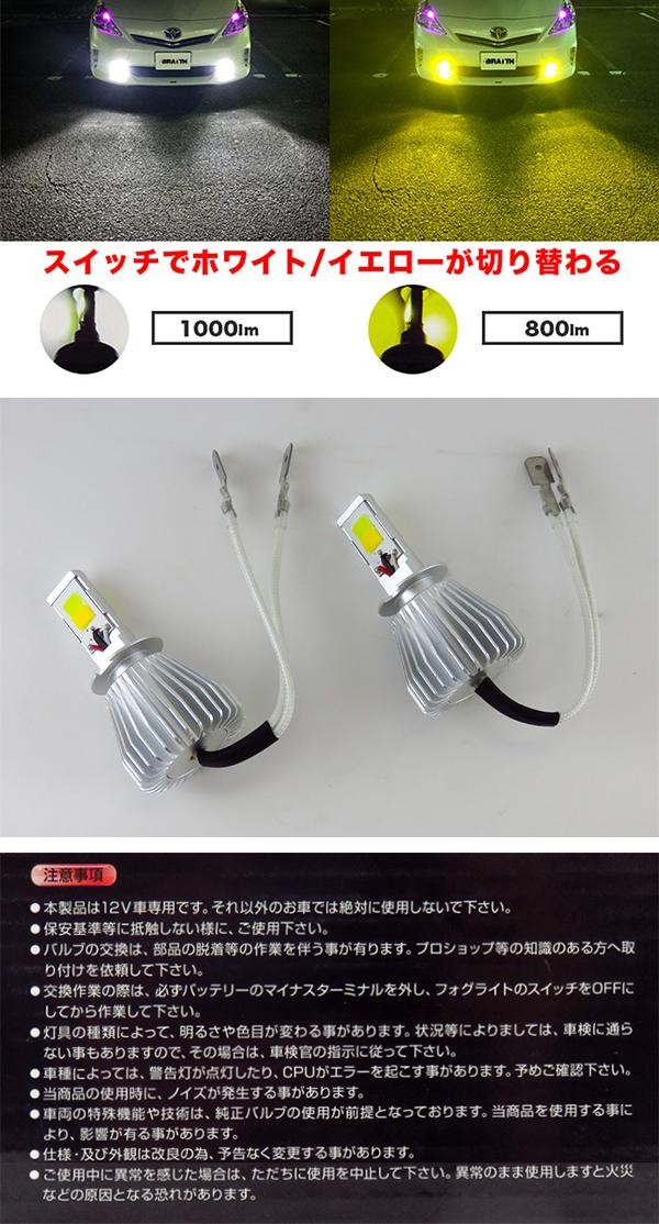 | 仕様 | H3対応 電圧:DC12V 出力:20W相当 明るさ:800lm(イエロー)、1000lm(ホワイト) 取扱説明はパッケージに記載あり |