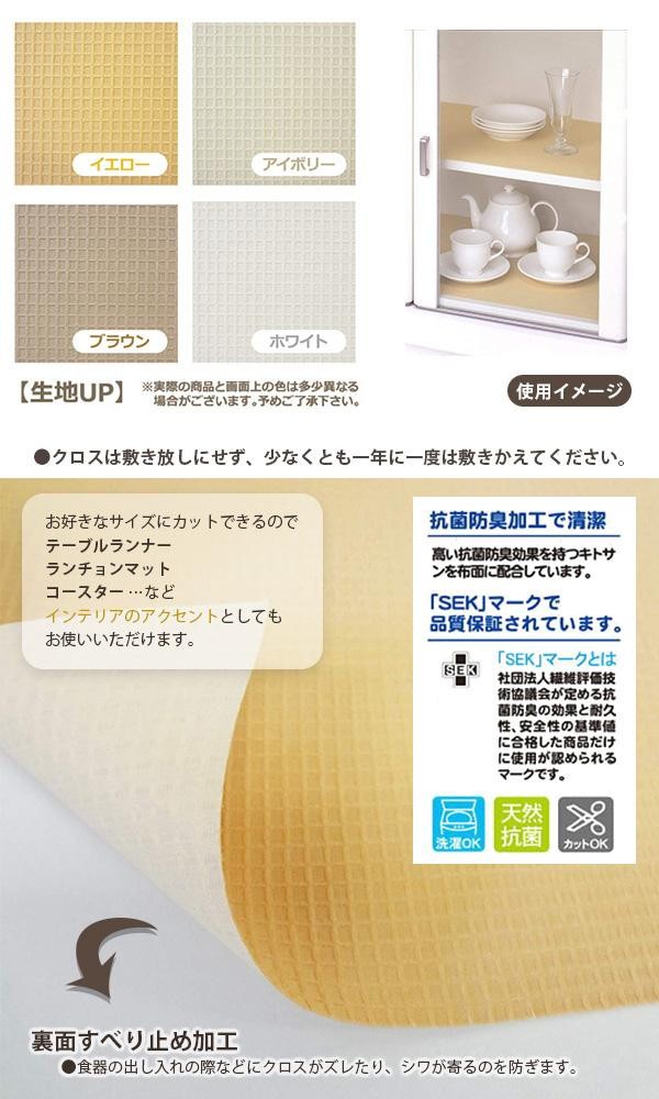 | 糸ほつれ防止加工を施しているので、ご家庭の食器棚に合ったサイズに自由にカットして使用可能!おしゃれなワッフル織の布で、大切な食器をやさしく守ります。布面には抗菌・防臭効果を持つキトサンを配合。 |
