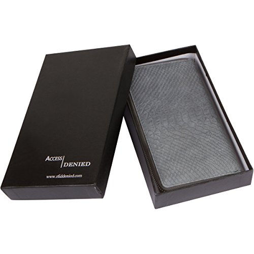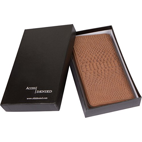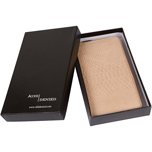 -. Binding : Apparel -. Brand : Access Denied -. Department : womens -. Feature : Luxuriously Soft Two tone Smooth Leather and Anaconda print Embossed Genuine Leather / Interior features 1 center zip coin compartment, 8 card slots, and 2 bill compartments / RFID Blocking Technology securely woven into every fold of this wallet to keep your identity safe+Independent lab tested and certified for RFID protection / Measures approximately 7.5" x 4" x .75" - Gift Box included / The subtle Anaconda print adds a pleasing visual texture to the exterior of the wallet, as well as the smooth leather zip compartment in the back. Exterior also features a full zip around closure and a large Accented zipper pull for ease of use. -. PackageQuantity : 1 -. ProductGroup : Apparel -. ProductTypeName : ACCESSORY -. Size : One Size -. Title : Access Denied Womens RFID Blocking Wallet TwoTone Smooth and Embossed Anaconda Leather Secure Zip Around Clutch