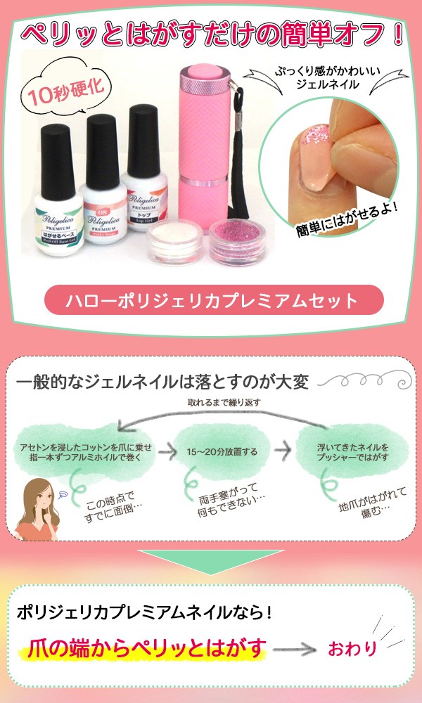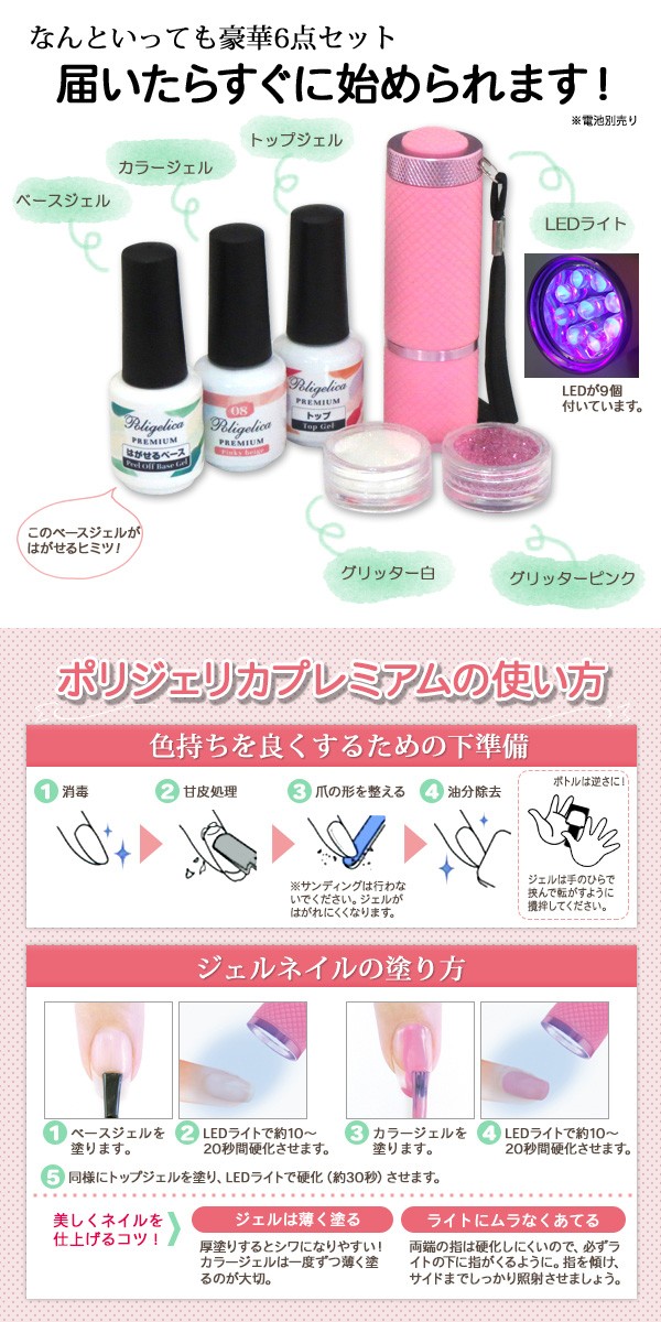 | セット内容 | ベースジェル、カラージェル、トップジェル、グリッターホワイト、グリッターピンク、LEDライト |
