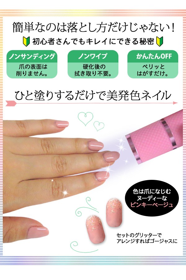 | 初心者でも安心簡単のマニキュア型ジェルネイル。爪を削らずに直接塗れてライト硬化時間も約10秒と時短!オフもリムーバー不要でペリッと簡単にはがせます。 |