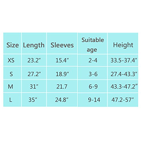 Raincoat size: XS size: length 23.2"", sleeves 15.4"", suit for 2-4 years old, reference height 33.5-37.4in S size: length 27.2"", sleeves 18.9"", suit for 3-6 years old, reference height 37.4-43.3in M size: length 31"", sleeves 21.7"", suit for 6-9 years old, reference height 43.3-47.2in L size: length 35"", sleeves 24.8"", suit for 9-14 years old, reference height 47.2-57in