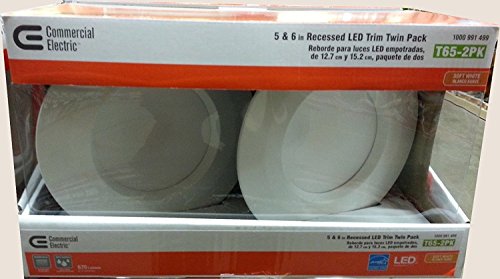 The Commercial Electric 5 in. and 6 in. Recessed LED Trim (2-Pack) with clean and elegant design is ideal for glare free lighting in any room of the house. This ETL classified high efficiency dimmable Trim has received Energy Star Certification for year-round energy savings. Compatible with dimmer switch for different illumination needs and increased energy saving. This LED Trim is for use with 5 in. and 6 in. IC and Non-IC recessed housings and will retrofit 5 in. and 6 in. incandescent housings to energy saving LED down lights. Reduce energy consumption to 11 watt LED - comparable to BR30/65 watt incandescent bulb. Rated for wet location make it applicable for shower and exterior application. SPECIFICATIONS DIMENSIONS Aperture width (in.) 6 Assembled Width (in.) 7.50 in Assembled Depth (in.) 7.50 in Size 6 in. Assembled Height (in.) 2.75 in DETAILS Actual Color Temperature (K) 2700 Fixture finish family White Adjustable Lamp Head No Light Output (lumens) 670 Color Rendering Index 90 Light Source LED Color Temperature Soft White Product Weight (lb.) 1.25 lb Fixture Finish White Returnable 14-Day WARRANTY / CERTIFICATIONS Certifications and Listings 1-UL Listed,ETL Listed Manufacturer Warranty 5-year limited warrantyFeature