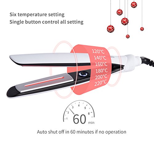SMART FEATURE- Single button control all function, 1 inch ceramic tourmaline floating plates, 3D Floating plate, tapered plates create a smooth touch and low friction perfect for styling, 6 temperature settings between 120C- 220C( 248F- 428 F), LCD display, worldwide dual voltage, auto shut off if no operation in 60 minutes, 360 swivel cord.