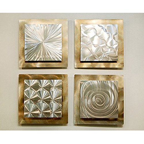 - This is a four piece set of hand-etched metal wall art. Each piece measures 12 in x 12 in x 2 in (30.48 cm x 30.48 cm x 7.62 cm). You can arrange this metal wall accent in a number of distinctive and attractive configurations.