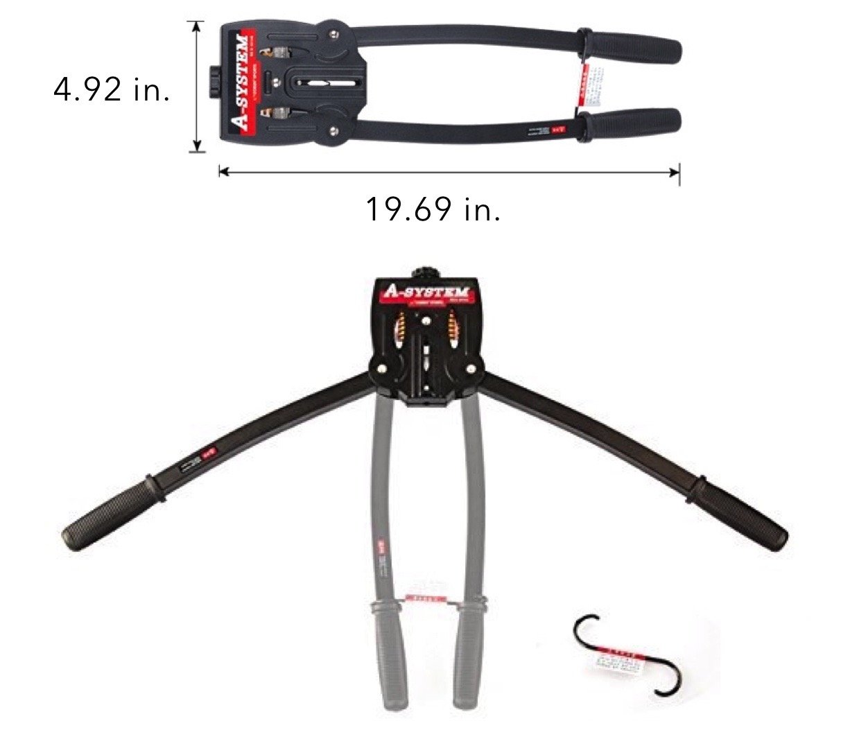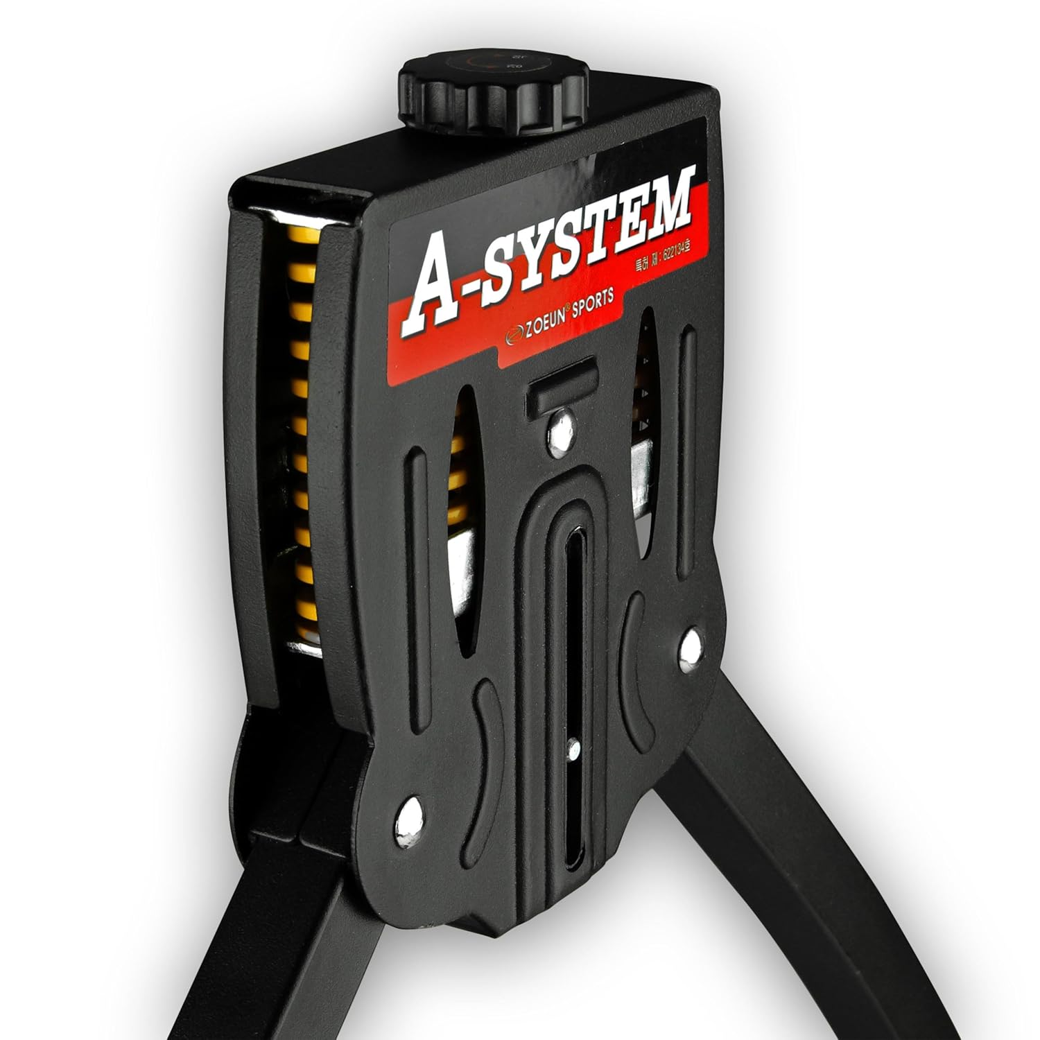 To work out, close the handles to exert pressure on the A-System's compression springs. To increase or decrease the resistance, simply turn the adjustment knob left or right. Resistance is between 17 to 46 pounds