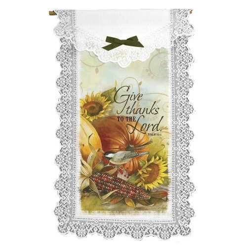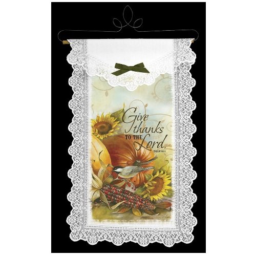 Joyful Harvest 12-inch by 20-inch Ecru Wall Hanging wall decor for autumn, to celebrate the bountiful harvest and a happy Halloween. Says "Give thanks to the Lord. Psalm 92:1"