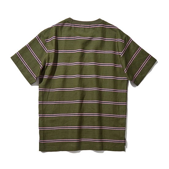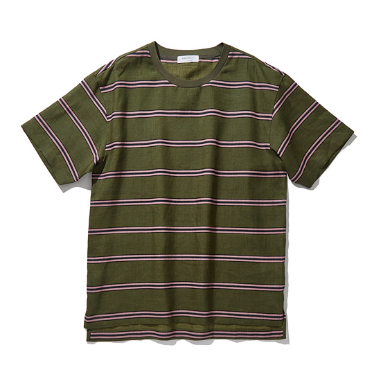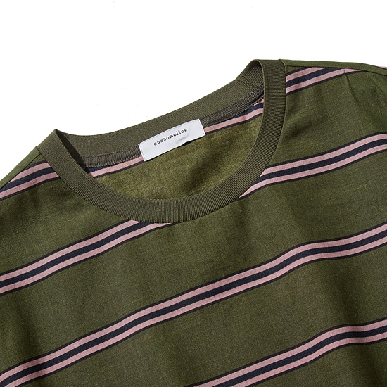 - 컬러배색과 스트라이프 패턴이 돋보이는 남성 라운드 우븐 티셔츠.