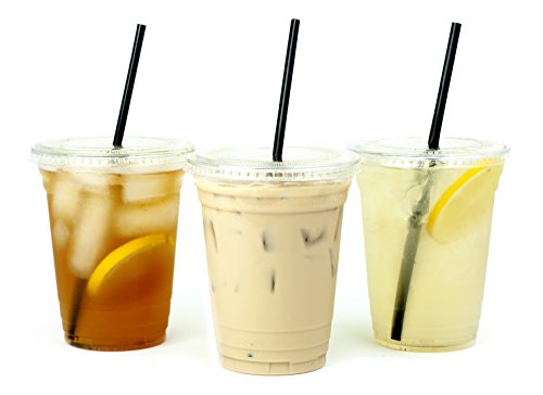 - 100 PIECE SET + Extra Straws (100 Cups/100 Lids/110 Straws) -16 oz. Clear Plastic Cups w/ Flat Lids and Straws. Great for cold drinks like: Iced Coffee, Smoothies, Bubble Boba Tea, Tapioca Drinks, Milkshakes, Frozen Cocktails, Water, Sodas, and Juice. Resists cracking! Shatter Resistant!