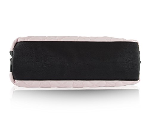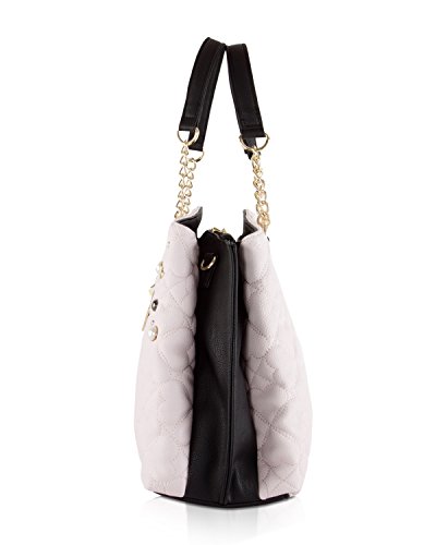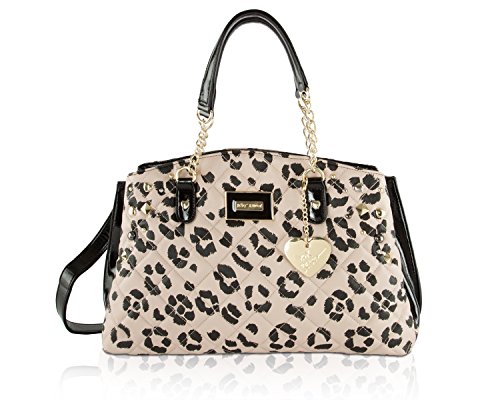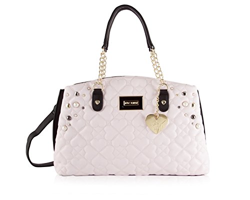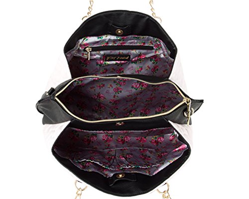 Fashion's in full bloom with this adorable wagon Satchel shoulder bag from Betsey Johnson. Purse features Quilted heart argyle body pattern, black sides with pearl stud details and dangling gold heart with Betsey Johnson signature plate, Making it fun and flirty. Gold color hardware Double top rolled handles with 7 drop, includes detachable Chain detailed cross-body strap with 23 drop, Open top with trigger clasp closure, fully lined interior, 2 main and Center Middle zipper compartment with sides with 2 wall slip pockets and 1 wall zipper pocket, It Brightens up your outfit with a pop of personality.Feature