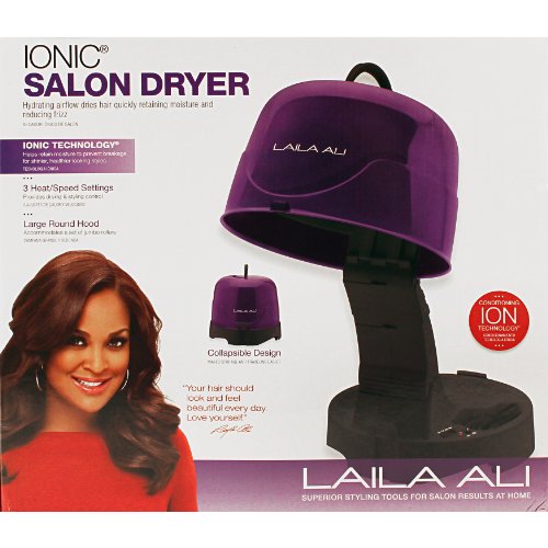 ReleaseDate : 2012-09-01 Studio : Laila Ali Publisher : Laila Ali Binding : Health and Beauty Product Description The purple and black salon ionic dryer uses ionic technology to help retain moisture to prevent breakage so you can have shinier, healthier-looking hair styles. If you don't want to use the ionic technology you can turn it off with the on/off switch, and there is an on indicator light to let you know when the ionic technology is turned on. The balanced airflow design dries hair evenly and has 2 heat and speed setting so you can choose the setting for perfect drying and styling control. When you are done drying and styling your hair you can use the cool setting, which releases cool air to set the style. The large round hood of the dryer can accommodate a jumbo set of rollers. The dryer's convenient cord storage area and collapsible design makes storage and travelling easier. 0