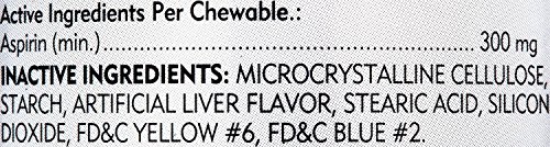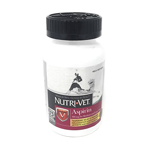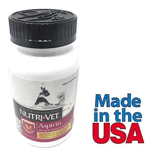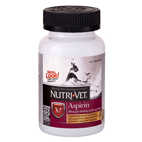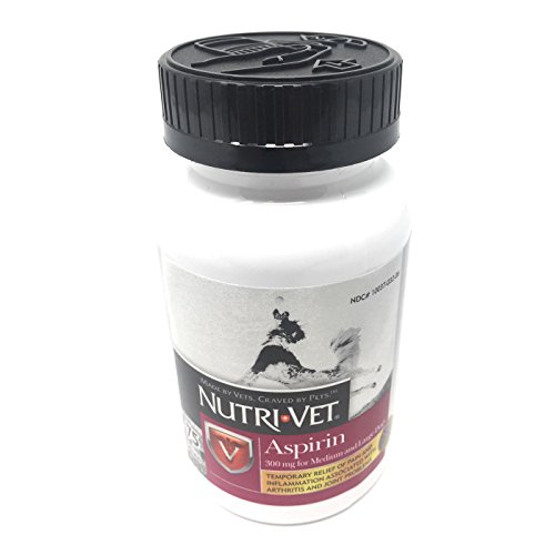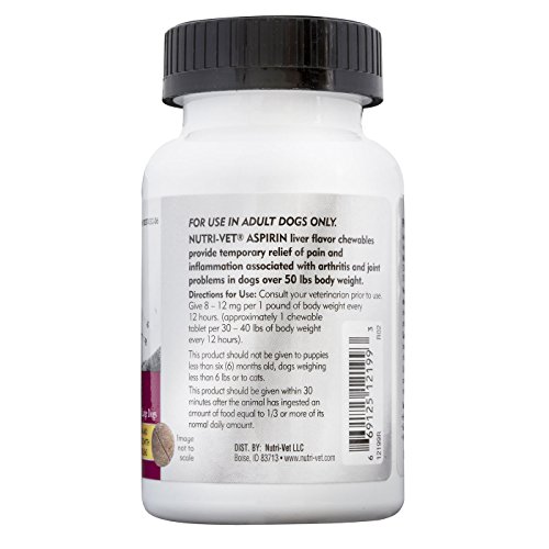 Nutri-Vet offers a wide range of unique, veterinary formulated animal supplements and complementary external products that promote health and well being in pets. Sophisticated formulas combined with innovative delivery systems and high palatability profiles have positioned Nutri-Vet as the leading provider of natural animal products in North America. Aspirin liver flavor chewables provide temporary relief of pain and inflammation associated with arthritis and joint problems in dogs over 50 lbs body weight. The liver flavor makes it easy to give and less upsetting to stomach. Feeding Instructions: Consult your veterinarian prior to use. Give 8 - 12 mg per 1 pound of body weight every 12 hours. (Approximately 1 chewable tablet per 30-40 lbs of body weight every 12 hours.) This product should be given within 30 minutes after the animal has ingested an amount of food equal to 1/3 or more of its normal daily amount. Ingredients Per Chewable: Aspirin (Min.) - 300 mg Inactive Ingredients: Maltose, Beef Liver, Stearic Acid, Microcrystalline Cellulose, Whey, Starch, Silicon Dioxide, Barley Malt, Dried Milk, Sodium Bicarbonate, Salt. Cautions: This product should not be given to puppies less than six months old, dogs weighing less than 6 lbs or to cats. Pictures may be magnified to show detail. For further information on size, color, conditions please refer to the item description or please ask a question before buying.Feature