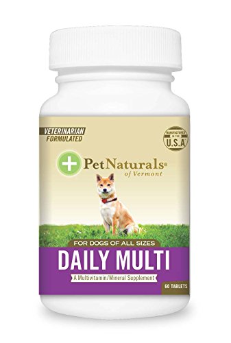 -. Binding : Misc. -. Brand : Pet Natural's Of Vermont -. EAN : 0026664007247 -. Feature : Daily Multi tablets include 28 nutrients to help keep dogs of all ages in peak condition. A quality multivitamin can help fill nutritional voids in commercial pet foods due to processing / Daily Multi for dogs is a veterinarian formulated supplement and has been approved for use in dogs of all ages by our veterinarian review board / Our multivitamin is free of corn, artificial ingredients and wheat that may cause digestive upset / Our tablets have a delicious duck flavor which makes them easy to give while providing the value of a tablet for long term use / All Pet Natural's of Vermont products are manufactured in the USA and distributed from our offices in the Green Mountains of Vermont -. Label : Vetri-Science Laboratories -. Manufacturer : Vetri-Science Laboratories -. Model : 070086F.060 -. MPN : 070086F.060 -. PackageQuantity : 1 -. PartNumber : 070086F.060 -. ProductGroup : Pet Products -. ProductTypeName : PET_SUPPLIES -. Publisher : Vetri-Science Laboratories -. Studio : Vetri-Science Laboratories -. Title : Pet Natural's of Vermont 60 Count Multivitamin Formula Tablets for Dogs -. UPC : 026664007247