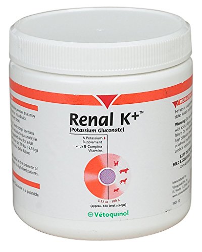 -. Binding : Misc. -. Brand : Renal K -. EAN : 0802697474757 -. Feature : Renal K+ Powder provides supplemental potassium for the management of hypokalemia in cats and dogs. / Oral potassium supplementation helps minimize muscle weakness induced by potassium depletion, improves renal function and may play an important role in the management of chronic kidney disease. / Renal K+ Powder is a highly palatable formula that contains potassium gluconate and B-complex vitamins. / It may be sP.R.Inkled over or mixed with food. / Give adult cats and dogs 1 scoop (530 mg) per 10 lbs. body weight twice daily. -. Label : Renal K -. Manufacturer : Renal K -. PackageQuantity : 1 -. ProductGroup : Pet Products -. ProductTypeName : PET_SUPPLIES -. Publisher : Renal K -. Studio : Renal K -. Title : Renal K+ Powder Potassium Citrate Kidney Supplement for Dogs and Cats 100 g -. UPC : 802697474757