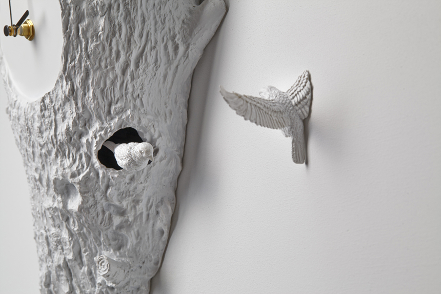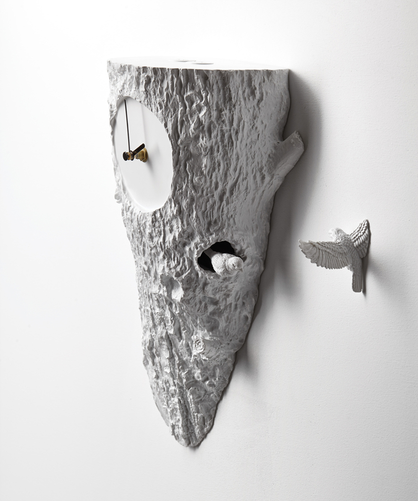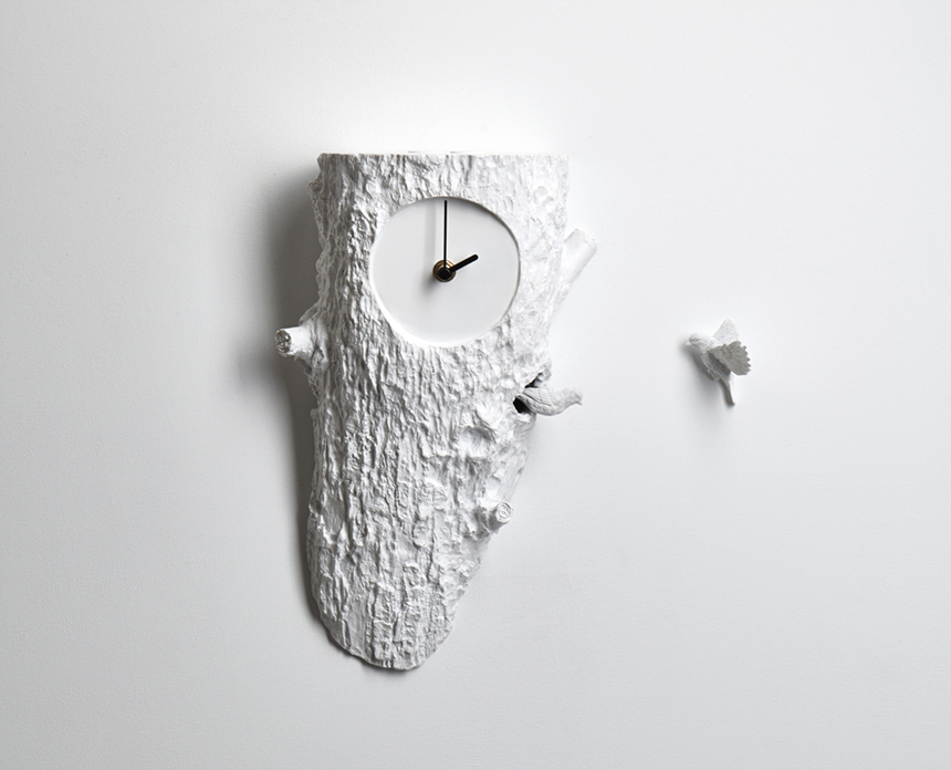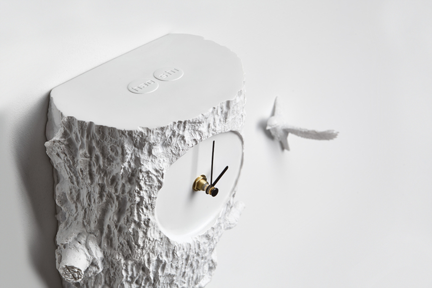 제품 디자이너 Griffin Yang을 통해 디자인된 뻐꾸기 벽시계로 정각이 되면 새들의 지저귀는 노랫소리가 들립니다.