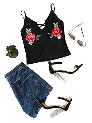 -. Binding : Apparel -. Brand : SweatyRocks -. Department : womens -. Feature : Material: Polyester / Spaghetti Strap, Rose Embroidered Patch, Lace Up V Neck / Suitable for summer, great with skirts or shorts / features ribbed fabric, lace up fornt amd crop cut / Please refer to the size measurement below before ordering -. ProductGroup : Apparel -. ProductTypeName : SHIRT -. Title : SweatyRocks Women's Floral Embroidered Camisole Tank Top Lace Up Knit Crop Tops