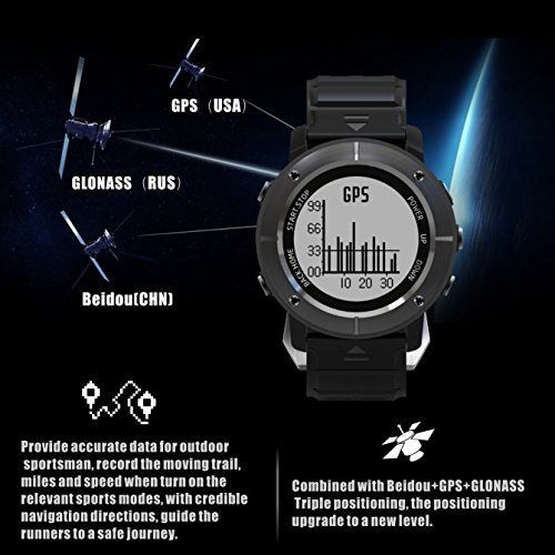 Over 10 Sports Models Swimming:Time/Miles/Temperature Climbing:Height/Time/Steps/Mileage Riding:Time/Mileage/Speed/Heart rate Rock climbing:Height/TimeHeart rate Hiking:Time/Mileage/Steps/Calories Surfing:Time/Mileage/Speed Marathon:Time/Mileage/Speed Boating/Skiing/Golfing.etc. Running:You can check the run time/pace/miles/Km and heartrate status(Normal Mode) Setup the train time distance and pace,remind by vibration if the pace doesn't meet the requirement,and display the heartrate status. Return Cruise:Setup a start location,press the "View return direction " icon When returning,the watch will guide the direction and distance to the start position,the user can go back to the start based on the direction. Maze Escape:When one get lost and trapped in a place,turn on the function,it will record recent location and display the distance and direction when you're moving to get out of the maze.