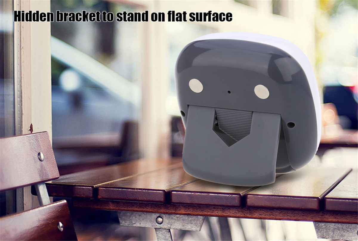 Fitted with 2 small round magnets to fix on the metal surface and 1 bracket to stand on flat surface.