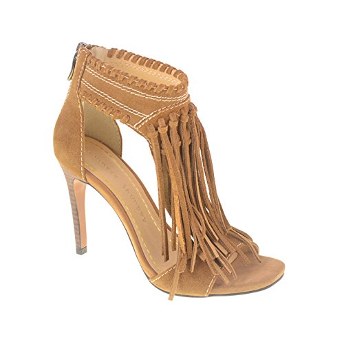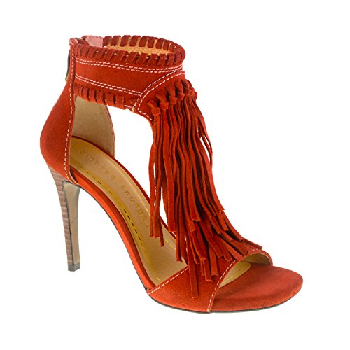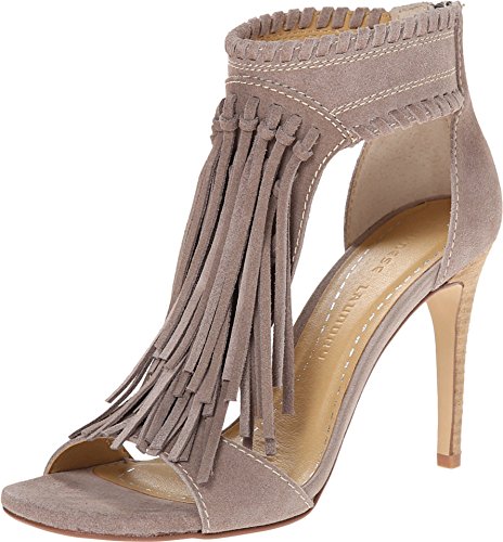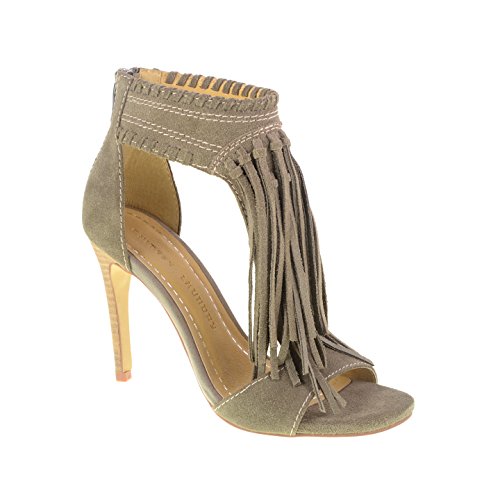 Cascading fringe gives a bohemian feel to this t-strap sandal with ankle cuff. The Santa Fe has a back zip for easy wear. By Chinese Laundry. Suede 4" heel Color - GREYFeature