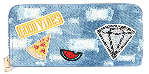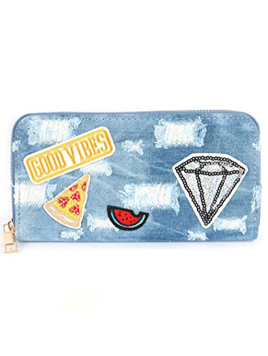 Product Description BAG ACCESSORY PATCHED DENIM FABRIC CLUTCH WALLET DISTRESSED FABRIC GOOD VIBES MESSAGE PIZZA DIAMOND WATERMELON ZIPPER CASH POCKET COIN POCKET CREDIT CARD POCKET ONE SIZE 7 1/2 INCH WIDE 4 INCH TALL 0