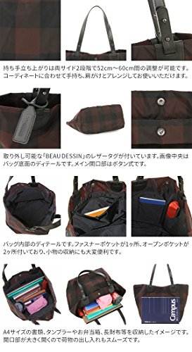 -. Feature : 外寸:縦27cm×横(開口部)48cm、横(底部)31cm×まち17cm ・内寸:縦26cm×横(開口部)47cm、横(底部)30cm×まち16cm / 重さ:270g ・持ち手立ち上がり:52cm~60cmの間で左右2段階で調整可能(横幅2cm) / 収納書類サイズ:A4 ・メイン開口部:ボタン ・内ポケット:オープン×2ヶ所、ファスナー×1ヶ所 / 表素材: ナイロンチュール(チェック柄) ◇手ざわり: 柔 □■□□□ 硬 (※表記は目安です)  ・裏地: 有り(ナイロン) / MADE IN JAPAN(日本製)