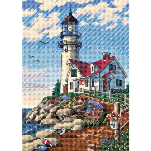 Standing tall against a brilliant sky, this guardian of the sea alerts sailors to the rocky shoreline. Kit contains cotton thread, 18-count white Aida, needle and easy instructions. Finished size: 5 by 7 inchesFeature