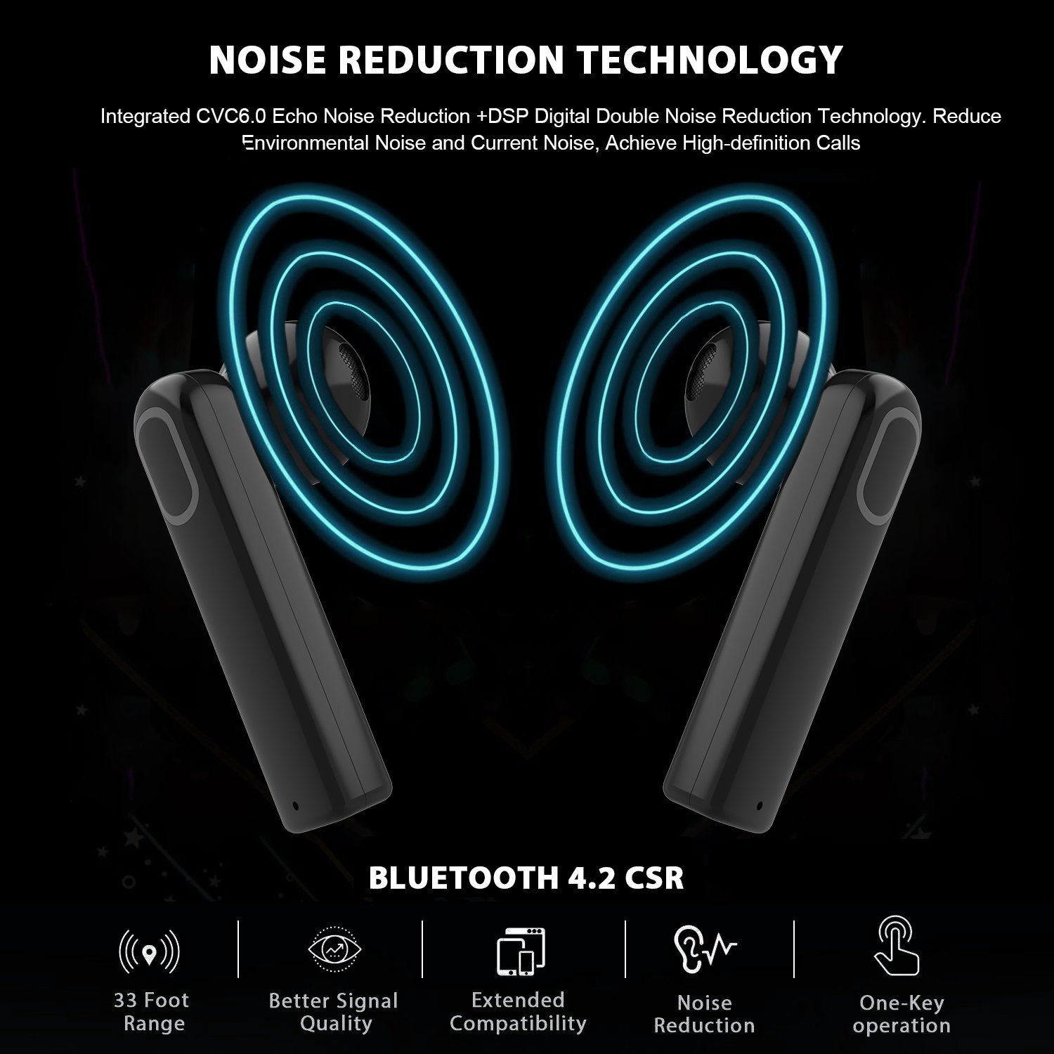 【Bluetooth4.2・高音質・CVC6.1ノイズキャンセリング搭載】Bluetooth4.2を採用し、ほとんど(99.9%)のbluetooth デバイスに対応でき、速く安定にペアリングできます。また、最高音質で低遅延、高品位な音質が得られるだけでなく、ワイヤレスイヤホン/ワイヤレスヘッドホンの難点である音の遅延も小さく抑えられ、高音質のステレオオーディオをお楽しみいただけます。更にCVC6.1ノイズキャンセリング搭載し、雑音を消し、相手の声が聞き取りやすくなります、相手とクリアな通話を実現できます。