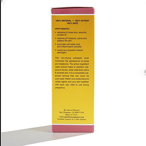 This non-drying antiseptic toner minimizes the appearance of pores and breakouts breakouts in the morning after cleansing and it can be used though out the day, especially to balance and regulate oil and shine. Main purpose of toner is: deep pore cleansing and to better prepare the skin for next step-which is hydration. The active ingredient - neem extract helps to disinfect, balance and renew, while calendula calms and soothes skin. Watch your pores become visibly tighter and your skin healthier with each use. Safe to use during pregnancy. Great for combination, oily and acne prone skin. Soothes and calms. Reduces inflammation and inhibits bacteria growth. 3- in 1 formula: It works as a powerful natural astringent (tightens pores), as well as to remove excess dirt after cleansing (toner) and also to reduce inflammation and bacteria growth. Benefits: Organic Lemon Verbena Distillate - gently exfoliates and renews cells. Organic Calendula extract - soothes and calms. Organic Neem extract - reduces inflammation and inhibits bacteria growth. Organic Witch Hazel extract - provides antiseptic and anti-inflammatory benefits.Feature