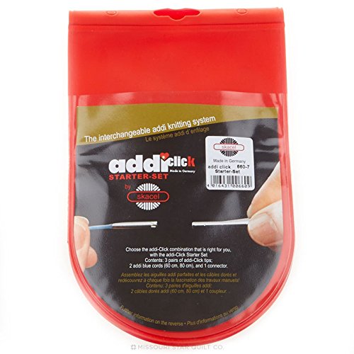 Each addi Click Starter set provides knitters with a sampling of 3 Click Basic needle sets: US 4 (3.5mm), US 7 (4.5 mm), US 10 (6mm); includes two cords: US 24in., 32in.; Metric 60, 80cm