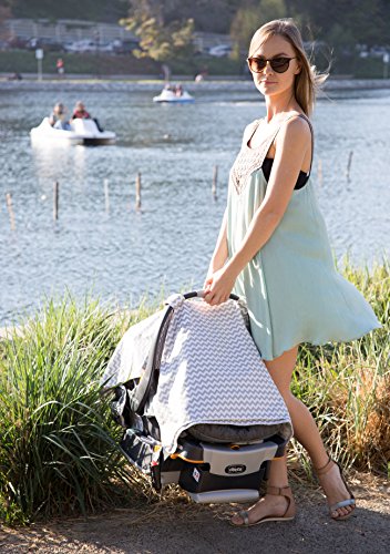 Two in one baby car seat and breastfeeding apron, perfect for moms on the go. Introducing our 100% natural bamboo muslin fabric car seat cover and breastfeeding apron. This must have accessory for moms and babies alike is the perfect way to give your baby a snug and secure zone of protection while giving you the peace of mind of an easy and discreet feeding session wherever you go. Our car seat canopy is designed to fit all major brands of newborn car seats such as Graco and Evenflo and acts as the perfect deterrent from wind, rain, insects, and harsh light. The dual function of our canopy allows you to easily detach it from your car seat and use as a discreet yet stylish apron for breast feeding or burping. Stop stressing about finding discreet place to feed your baby and travel in style with this two in one car seat cover and breastfeeding apron. The elastic and fitted stitching gives added security and stability even in high winds. Protect your baby from the elements while giving him or her a secure, snug and breathable canopy to rest and sleep under. Constructed of 100% natural bamboo muslin fabric our car seat cover is hypoallergenic and 100% free of harmful synthetics of BPA filled plastics. Ultra soft and breathable our canopy is guaranteed to creates a warm yet easy to breath environment for your little one. Stylish chevron pattern is a great look for both boys and girls. Travel with the security and protection of this two in one canopy and apron. Ideal for use in shopping centers, vehicles, parks, airports, or anywhere you need to feed with privacy. Stop stuffing your diaper bag with blankets or shawls to use as cover and reduce your daily load with this everyday accessory you won't be able to live without.