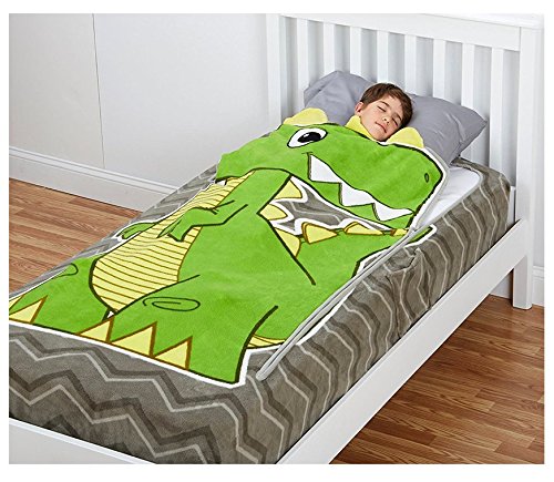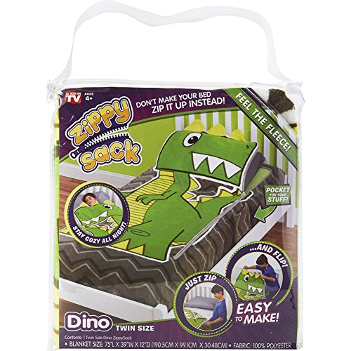 Twin size Zippy Sack Dino allows kids to transform their bed into a cuddly, cute friend. Fits just like a fitted bed sheet. Just zip and flip. Machine washable fleece. Measures 75"L x 39"W x 12"D. Comes in a plastic carrying case. Zippy Sack is like sleeping inside a soft, warm, fleece hug. Perfect for sleepovers. ZippySack is intended for children 4 years old and up. Machine wash cold on gentle cycle with like colors. Only non-chlorine bleach when needed. Tumble dry low. Wash before first use. Do not iron.Feature