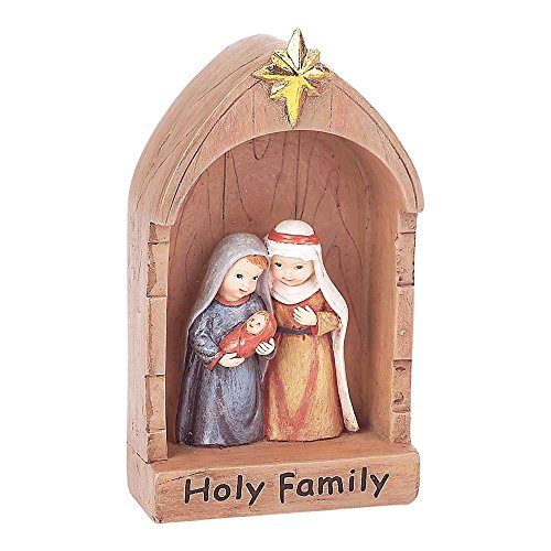 - Features whimsical Holy Family and Star within arched creche, and 'Holy Family' on base