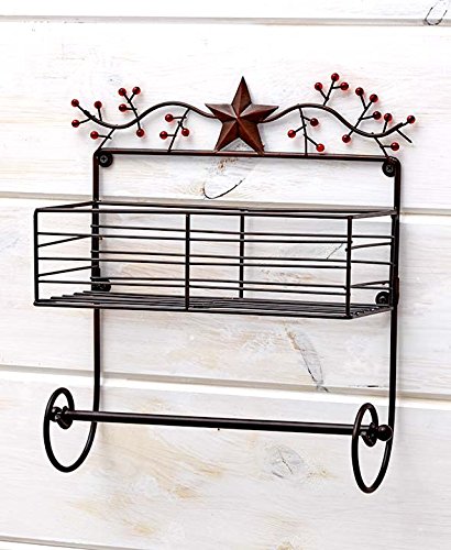 - Country Style Wall Mount Paper Towel Holder features decorative stars and berries. The Wall Mount Paper Towel Holder (13"W x 5-3/4"D x 16-1/4"H) has a bar at the bottom for holding a roll of paper towels with a basket above for spices, seasoning packets and more. Metal. Assembly required; assembly hardware included.