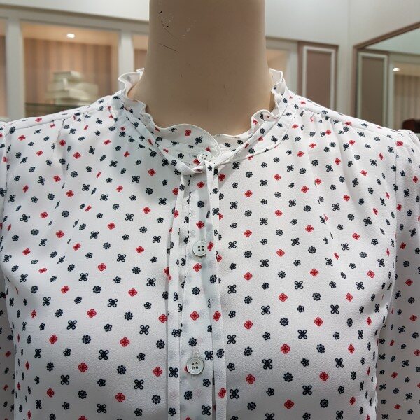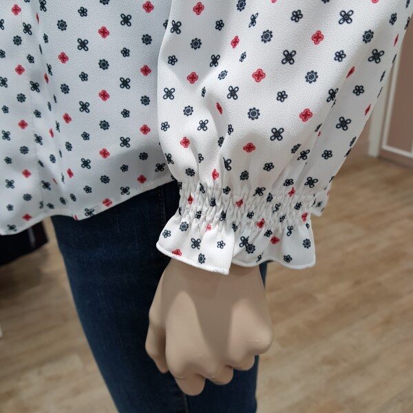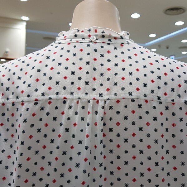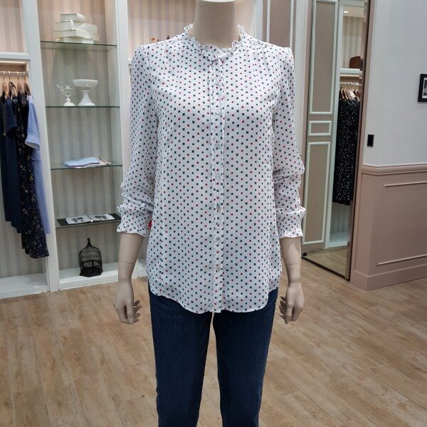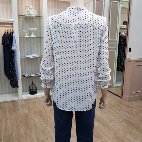 잔잔한프린트가 돋보이는화이트색상 블라우스리본끈 탈부착55기준 총장66cm