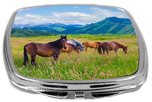 Rikki Knight Compact Mirror, Horses On Pink Meadow