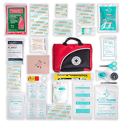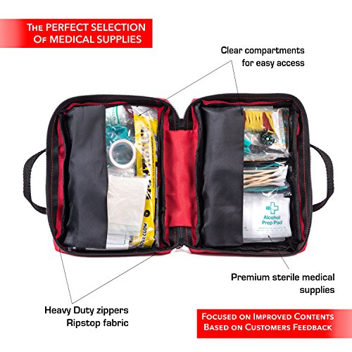 UPGRADED with valuable medical supplies, based on customers' feedback. Complete first aid kit, optimized for a large variety of injuries. Recommended for most daily use or survival adventures: Car, Home, Office, School, Road Trips, Camping, Hiking, Travel, Sports, Workplace and more. See the product images and description for a full list of contents.