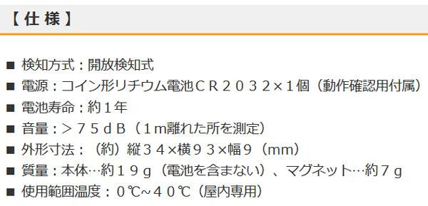 fk094igrjs窓やドアの無断開放を検知し、大音量警告音(約75dB)で侵入者を威嚇します警戒中・解除が一目でわかる、スライドスイッチ付きですサイズ個装サイズ:18×11×1cm重量個装重量:50g製造国中国両面テープで貼るだけの簡単設置!!窓やドアの無断開放を検知し、大音量警告音(約75dB)で侵入者を威嚇します警戒中・解除が一目でわかる、スライドスイッチ付きです