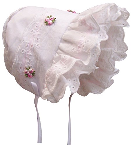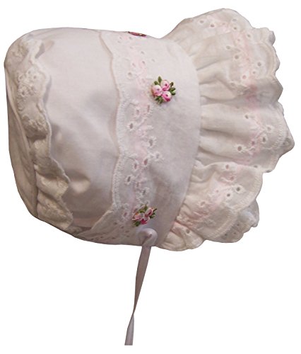Binding : Apparel Product Description Sun Caps by N'Ice Caps baby girl fancy eyelet bonnet with piping and rosettes. Has pink ribbon trim under eyelet brim and band. Color: white/pink. Available in 5 baby sizes. One size fits Infant X-Small (recommended for 1-2 months.) One size fits Infant Small (recommended for 3-6 months.) One size fits Infant Medium (recommended for 6-12 months.) One size fits Infant Large (recommended for 12-18 months.) One size fits Infant X-Large (recommended for 18-24 months.) Designed in the USA. Tested and approved as per CPSIA standards. 0