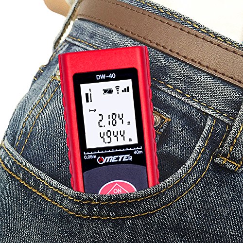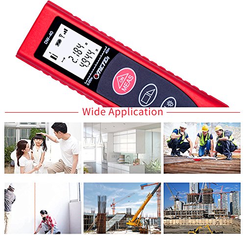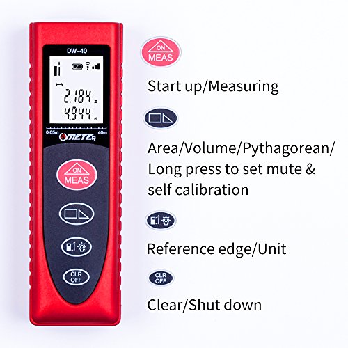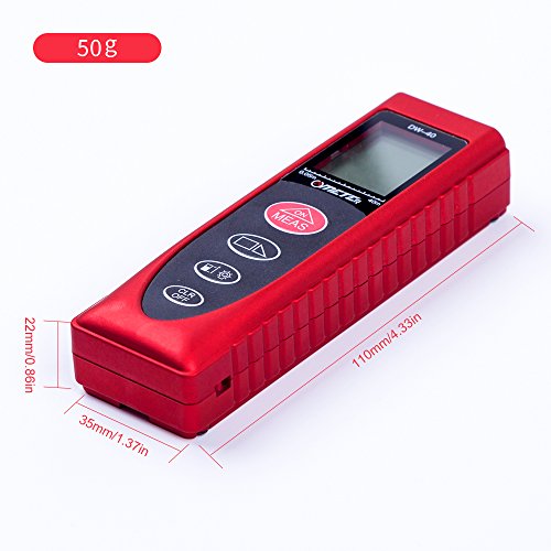 - Easy targeting with bright laser pointer. High accuracy(±2mm/±1/13inch) and wide measuring range from 0. 05m(0.16ft) to 40m(131ft). Quick measurement of distance, area and volume.