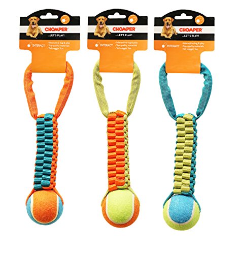 Studio : Boss Pet Products Publisher : Boss Pet Products Binding : Misc. Product Description The chomper 12 inch braided nylon tug with tennis ball and Ballistic nylon handle is great for rugged games of tug or fetch. Durable materials, nylon and tennis ball for added interest for your pet. Made of tough nylon for durable interactive play, tennis ball, and Ballistic nylon handle. High end, quality dog toy made to the highest standards and constructed to exceed expectations. Great for aggressive chewers. Your dog won't want to let go of this nylon tug and neither will you! assorted colors available, cannot request specific color. 0