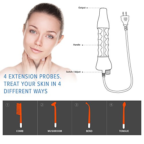 SAFTY AND PORTABLE: High frequency vibration of the machine accelerate the blood circulation to improve your skin conditions. The machine include the Insulated handle and glass probes for keeping safety, also it is easily can carry.