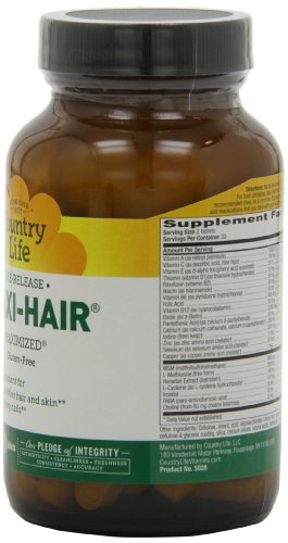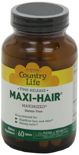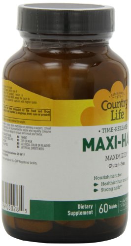 -. Binding : Health and Beauty -. Brand : Country Life -. EAN : 0015794050285 -. Feature : Nourishes nail, hair and skin / No artificial color, flavor and sweeteners / Does not contain wheat, gluten or milk -. Label : Country Life -. Manufacturer : Country Life -. MPN : 015794050285 -. NumberOfItems : 2 -. PackageQuantity : 2 -. PartNumber : 015794050285 -. ProductGroup : Health and Beauty -. ProductTypeName : HEALTH_PERSONAL_CARE -. Publisher : Country Life -. ReleaseDate : 2010-05-07 -. Studio : Country Life -. Title : Country Life Maxi Hair Time Release, 60-Tablet (Pack of 2) -. UPC : 015794050285