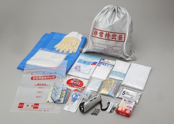 | セット内容 | 非常袋(380×450×10mm)、非常用給水バッグ5L、すべり止め手袋、ゴミ袋45L(10枚入)半透明、ラジオライト、ラジオライト用単4マンガン電池×3本、防災用ウェットティッシュ(20枚入)、防寒シート(210×130cm)、タオル200匁、救急絆創膏2サイズ40枚入、ホイッスル、ブルーシート2畳用、三角巾、マスク1枚、カイロ、緊急簡易トイレ、ハサミ、ピンセット、耳かき、毛抜き、ガーゼ2枚入、伸縮包帯、防災コンパクトガイド |