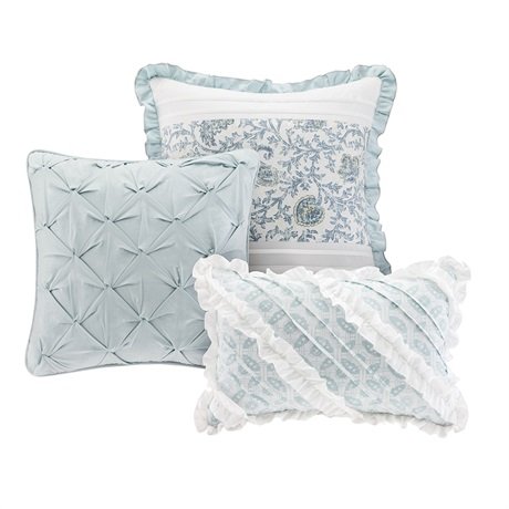 Studio : Luxury Home Publisher : Luxury Home Binding : Misc. Product Description For the stylish, modern room, Dawn holds all of the perfect elements to do shabby chic the right way. A mixture of soft Blue, periwinkle, and hints of green are printed in a paisley design alongside pin tucked Blue fabric that is separated by lace taping. A ruched white flange around the edge gives an extra touch to this beautiful set while three decorative pillows with pleating, embroidery and ruching details complete this look. 0