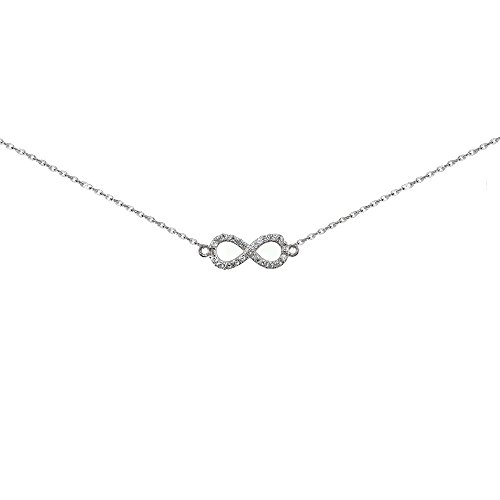 This attractive choker necklace showcases a small cubic zirconia studded infinity sign. The necklace is 13 inches long plus a 2 inch extender. It is crafted of sterling silver.