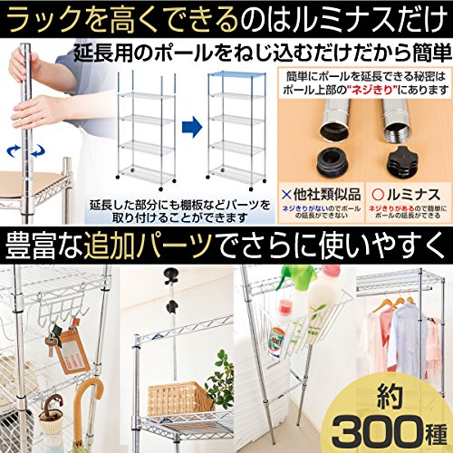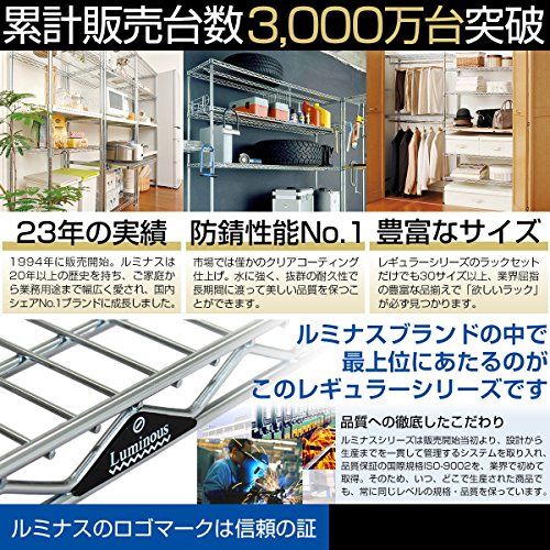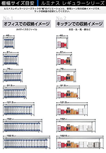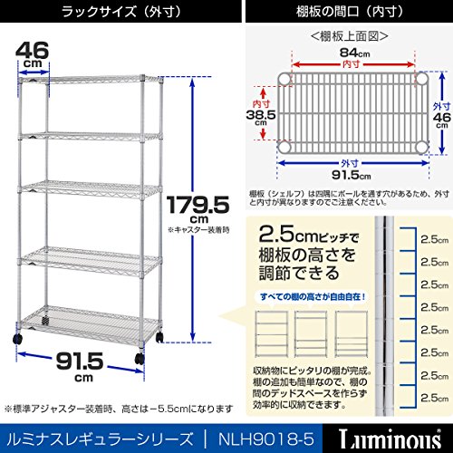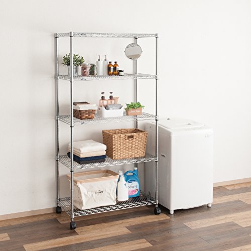 ●幅(約)91.5X奥行き46X高さ179.5cm●ポール径:25mm●棚一枚あたりの耐荷重 約250Kg●防さび加工(クリアコーティング仕上げ)●材質シェルフ(棚)・ポール:スチール(クロームメッキ)スリーブ:ABS樹脂●付属パーツ:標準アジャスター・ナイロンキャスター●棚の高さは約2.5cm間隔で調節可能●お客様組み立て品です。●ご注文間違い等のお客様都合による返品・交換はお受けできませんので寸法等、十分にご検討のうえご注文下さい。