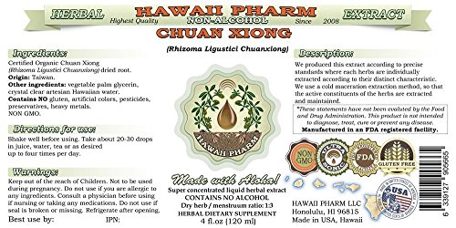 Expertly extracted Chuan Xiong ALCOHOL-FREE liquid extract! To purchase an Alcohol-based version of this extract please follow this link: http://www.amazon.com/gp/product/B00WQ7D89U/ (Copy and Paste the Link into a Browser Address Bar).