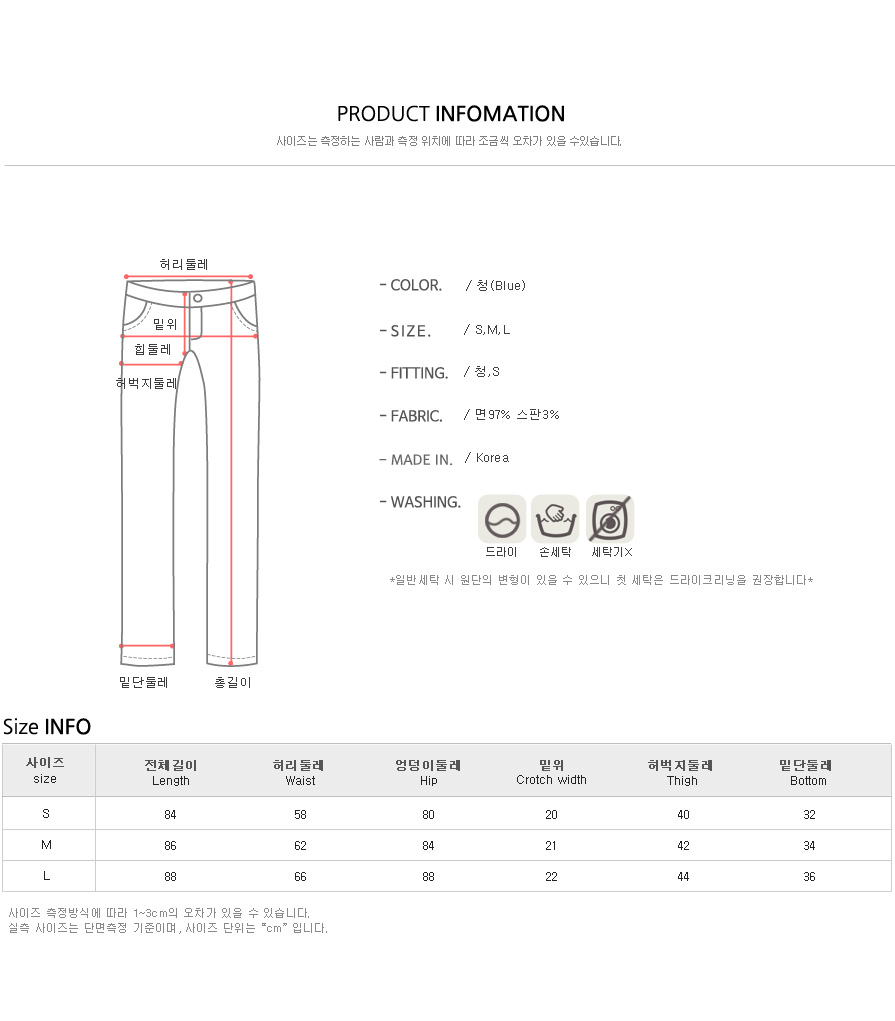 컬러는 청 한컬러구요 S,M,L 폭넓은 사이즈로