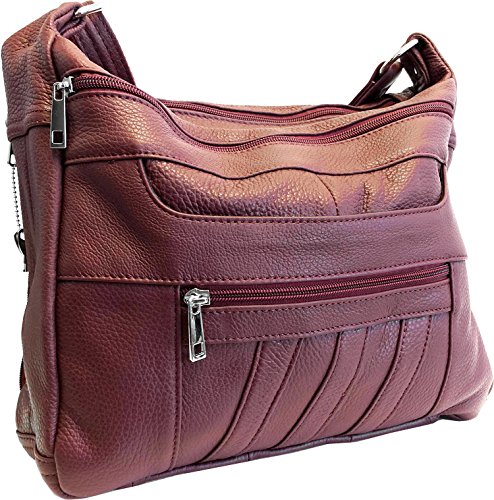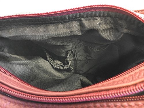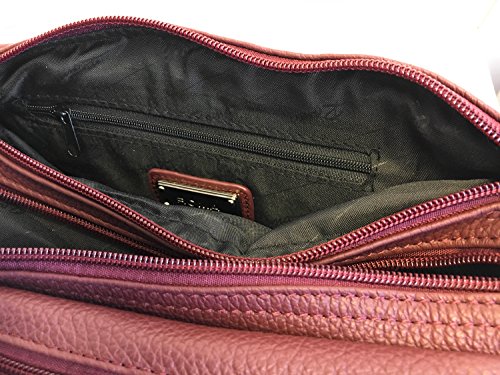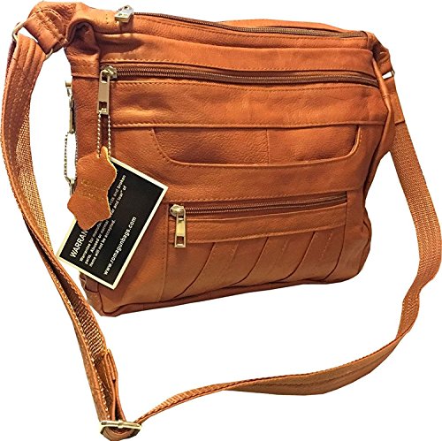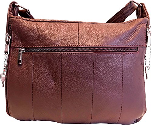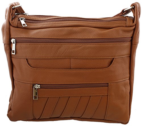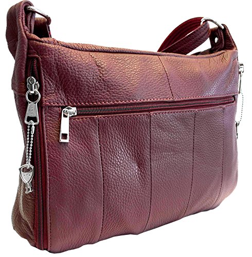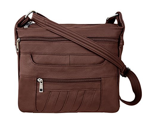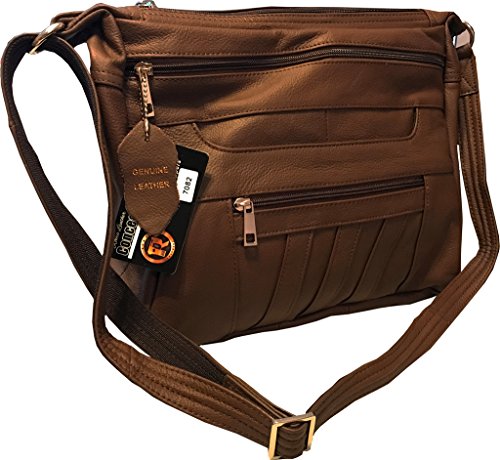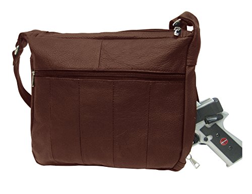 Product Description Roma Leathers 7082 concealed carry cross-body purse is not only stylish but well-designed. Equipped with a long adjustable shoulder strap suitable for cross-body carry, two large zipper openings in the top. The top zipper on the front of the purse opens to a full width and 3/4 deep compartment. The gun compartment is on the end and is closed by a YKK lockable zipper. Below this zipper is a curved top slot pocket. And below the slot pocket is a half length zipper compartment trimmed in lap-strake leather accent. 0