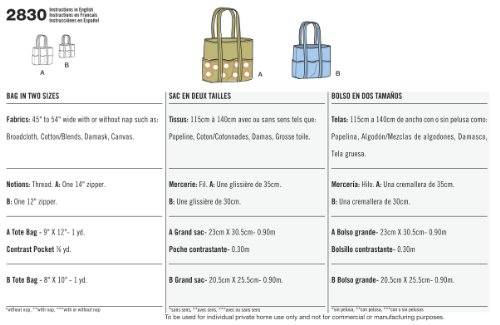-. Feature : It's so easy bags in size os (one size), simplicity pattern 2830 / Number of looks included:2 / Designed and manufactured in the u.s.a. / Sested Fabrics: 45-Inch to 54-Inch wide with or without nap such as: Broadcloth, Cotton/Blends, Damask, Canvas